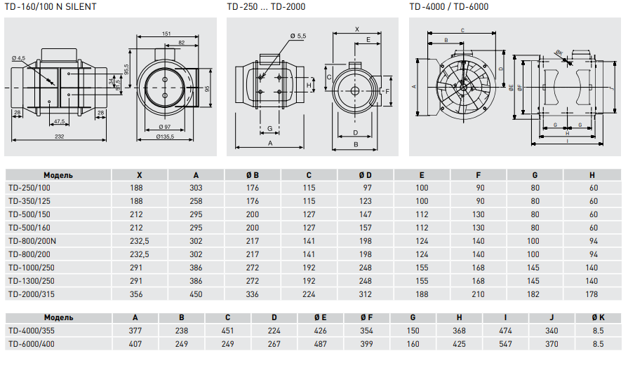 Вентилятори TD-MIXVENT виготовляються з високоякісного пластику (моделі від 160 до 800) і з листової сталі з епоксидним покриттям (моделі від 1000 до 6000). В залежності від моделі, вентилятори комплектуються пластиковими або алюмінієвими крильчатками (див. “Моделі”).