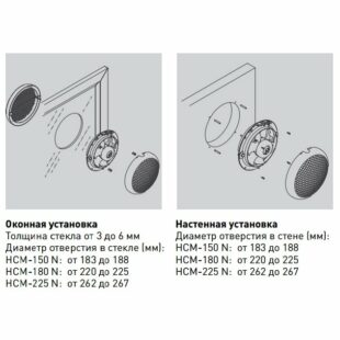 Витяжні вентилятори серії HCM-N призначені для настінної або віконної установки, з безпосереднім викидом повітря без системи повітроводів. Корпус і крильчатка вентилятора виготовлені з пластику. Вентилятори укомплектовані однофазними електродвигунами (230 В – 50 Гц), клас захисту IPX4, клас ізоляції B, плавким запобіжником та інерційними жалюзі. Вентилятори мають ІІ клас електробезпеки. Робоча температура від 0 до +40°С.